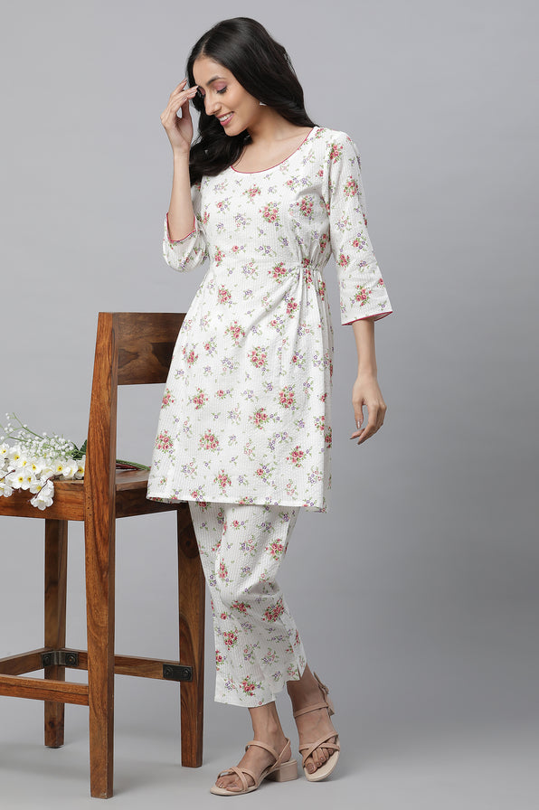 Kurta set for women in white with delicate floral prints, this ensemble offers a refreshing and graceful look. The straight kurta is paired with comfortable trousers, making it suitable for both festive gatherings and everyday styling. The floral print adds a touch of vibrance, while the soft fabric ensures comfort throughout the day. Perfect for summer festivities or casual events, it blends subtle charm with functional elegance. Accessorize with delicate earrings for a light daytime look or enhance with festive jewelry for cultural occasions. Its breathable texture and versatile design make it a wardrobe essential that transitions seamlessly from casual to celebratory wear. A timeless addition, this floral printed kurta set embodies simplicity with elegance.