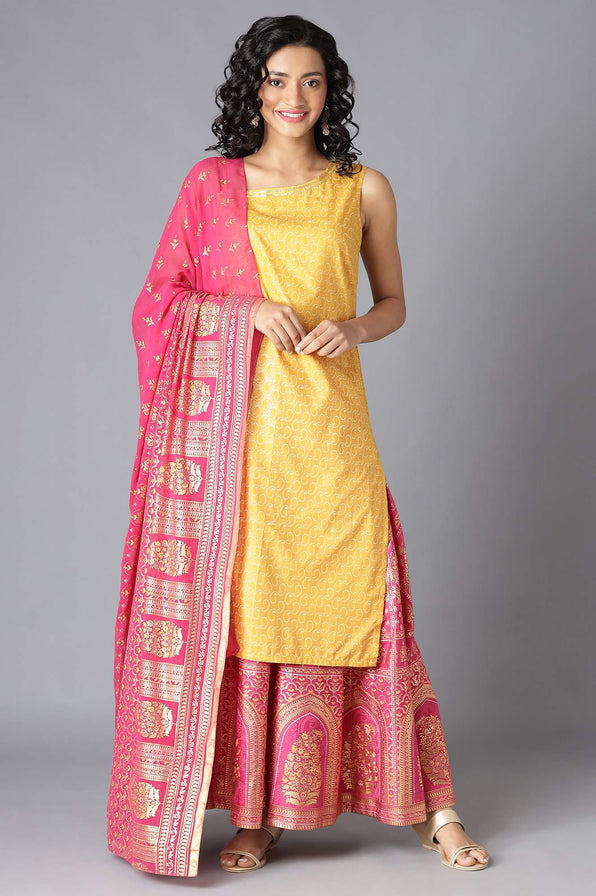 Are you looking for a statement -making set? Well, this modern ethnic kurta and skirt set is a perfect pick. The sleeveless kurta flatters one-shoulder neckline and has floral motifs. This straight silhouette top wear is adorned with sequin work and coordinated with a jazzy pink circular skirt. And to add an ethnic touch to it, the set comes with a pink dupatta.