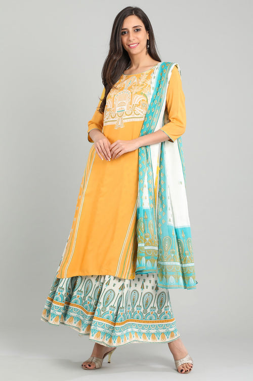 Yellow round neck 3/4 sleeve kurta with printed detail.