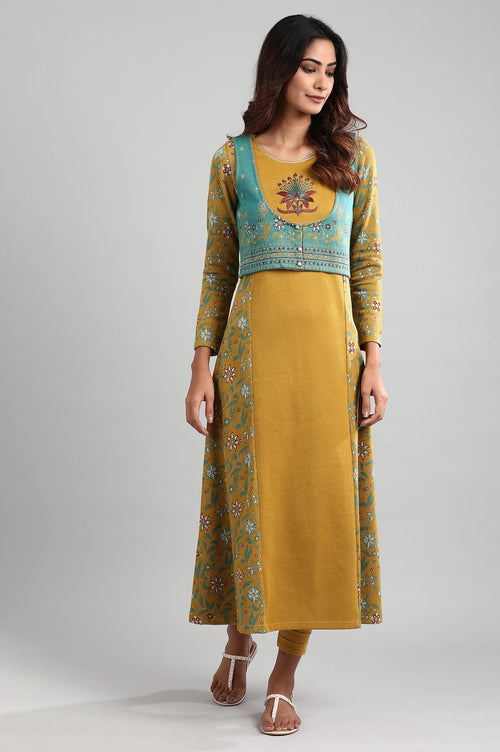 Yellow round neck full sleeve winter kurta with printed details, flared hem. Comes with a blue sleeveless koti with printed and button detail on the front.