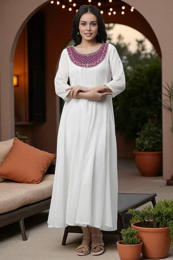 Make a statement with this purple festive dress, adorned with foil prints and intricate embroidery. Designed with ethnic detailing, it blends traditional richness with modern flair, making it ideal for weddings, receptions, and festive evenings. The flattering silhouette ensures comfort and elegance, while the combination of embroidery and foil print adds opulence. Perfect as a festive dress for women, it reflects ethnic artistry while keeping the design lightweight and easy to wear. The deep purple tone enhances its regal appeal, making it a standout piece in any festive wardrobe. Easy to accessorize, it pairs beautifully with statement jewelry and metallic footwear. A must-have for women who love celebrating in style, this embroidered festive dress strikes the right balance of glamour and sophistication. Add this to your collection for an ethnic outfit that never fails to impress.