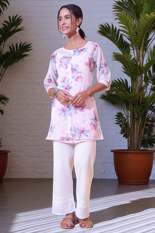 Step into effortless elegance with this women's floral printed kurti in sheer chiffon fabric. Featuring a round neckline and stylish 3/4th sleeves, this purple ethnic kurti blends comfort and charm. The vibrant multicolored floral print adds a festive touch, while the front placket detail enhances its contemporary appeal. Perfect for casual outings or ethnic wear occasions, it includes a matching printed spaghetti strap inner for added coverage and versatility. Ideal for daily wear, festive fashion, or office ethnic style.