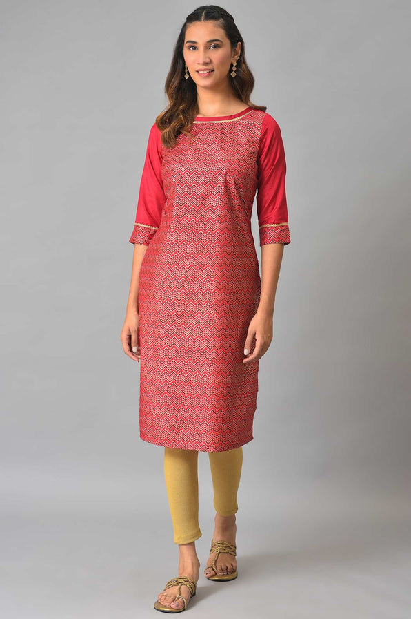 If You'Re An Admirer Of Comfort, This Kurta Would Be A Winning Choice For You. A Bright Red Colored Kurta That Has A Geometric Running Print. It Is Highlighted With A Triangle Shaped Lace With A Binding Detail And A Cuff Detail.