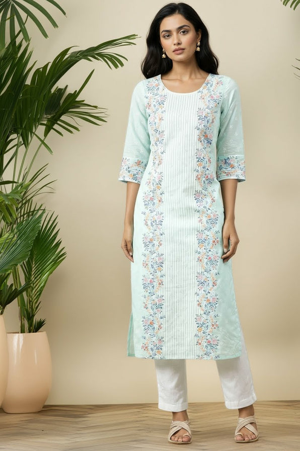 A refined river green rayon kurta, featuring a classic straight cut and a simple round neckline elevated by contrast piping detail on the neck and sleeves. The all over delicate schiffli embroidery adds a subtle yet distinctive touch of elegance to this timeless piece. This straight silhouette kurta has round neckline and three-quarter sleeves, and sleeves' hemlines are adorned with floral print.