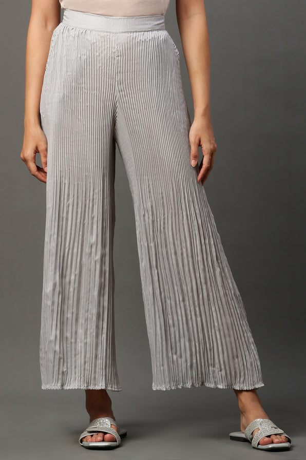 Crafted for festive elegance, this silver sharara features a radiant pleated design that exudes sophistication. The woven fabric offers a luxurious texture, while the partial elasticized waistband ensures comfort and ease of wear. Functional side seam pockets add practicality to its chic silhouette. Perfect for pairing with kurtas, crop tops, or short tops, this sharara is a versatile addition to your wardrobe.