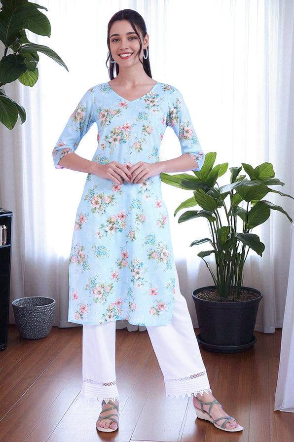 Discover the perfect blend of comfort and style with this Aurelia fusion kurta. Crafted from pure 60s cotton, this sky blue kurta offers a refreshing and breezy look for casual occasions. The three-quarter sleeves provide versatility, while the band neckline adds a touch of elegance. The straight cut and below-knee length create a flattering silhouette suitable for various body types. Featuring a slit detail, this kurta combines traditional elements with contemporary design. The woven construction technique ensures durability and a comfortable fit. Embellished with delicate lace accents, this kurta exudes a subtle charm. Perfect for women who appreciate a fusion of ethnic and modern styles, this Aurelia kurta is a versatile addition to any wardrobe. Its pure cotton fabric ensures breathability and comfort throughout the day, making it an ideal choice for casual outings or relaxed gatherings.