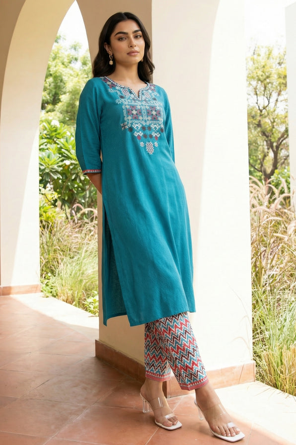 This teal blue straight kurta set is crafted from soft viscose fabric, ensuring breathability and comfort for all-day wear. The kurta features an intricately embroidered yoke and a classic round neckline, adding a touch of sophistication suitable for office wear or casual outings. Paired with multicolor geometric print pants, the ensemble offers a modern contrast to the traditional silhouette. The ankle-length trousers are designed with an elasticated waistband for a relaxed fit, while side slits on the kurta allow for ease of movement. Style this versatile ethnic wear with silver studs and comfortable flats for a polished look.