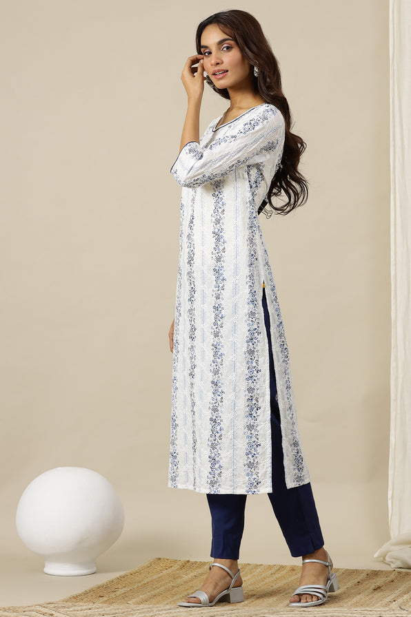 A charming white cambric kurta adorned with a delightful blue floral print, exuding freshness and grace. The fabric makes this kurta appropriate pick for the season, breathable, lightweight and more comfortable. It has straight silhouette and a basic round neck with binding, enhanced by contrast piping detail on the neckline and sleeves. The all-over intricate schiffli embroidery adds a touch of intricate elegance to this beautiful ensemble.