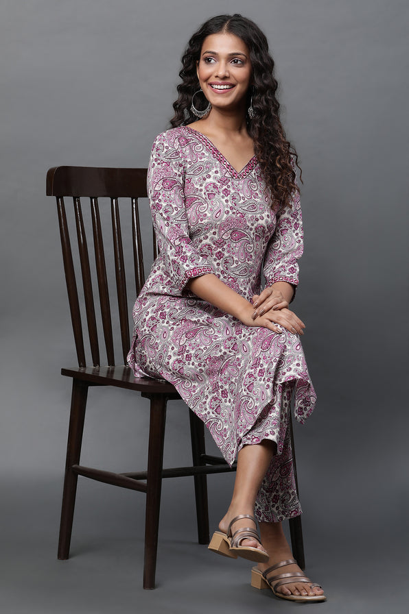 V-neck kurta with contrast detail around collar gives this piece a very feminine look and feel, this all over traditional print is a go to for every women if they want to look trendy yet traditional. This kurta is paired with matching pants. Get styled in this trendy co-ord set for a casual day or a movie date, even you can slay in this while travelling.