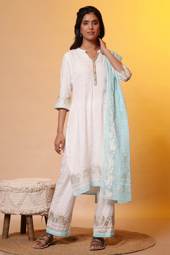 This blissful white and blue coloured Aurelia kurta set is apt for the season. The set is something which will turn everyone's head around. It has subtle detailing of gold all over and on neckline and the lace patch elevate the look of the piece. The kurta has beautiful floral border with a diamond dobby textured fabric gives it a very rich look. Bottom is a narrow palazzo with similar border print. As it makes a wholesome outfit, a contrast coloured drape has been given to lift up the whole look.