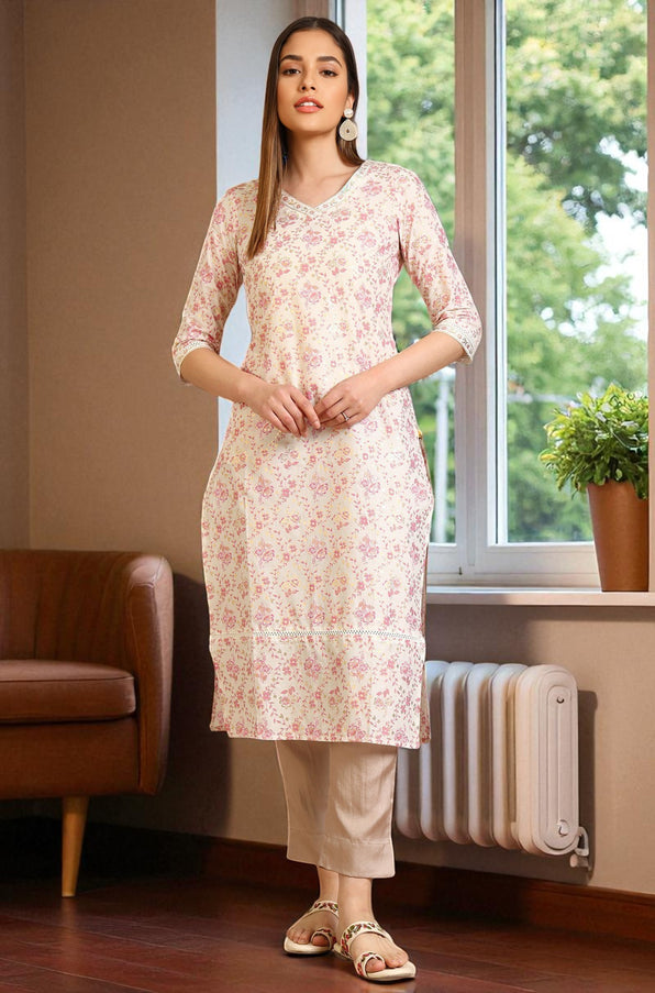 This everyday essential features soft floral motifs on breathable cotton, styled with a straight silhouette, round neck, and three-quarter sleeves. Its simplicity makes it versatile for both work and weekend wear.