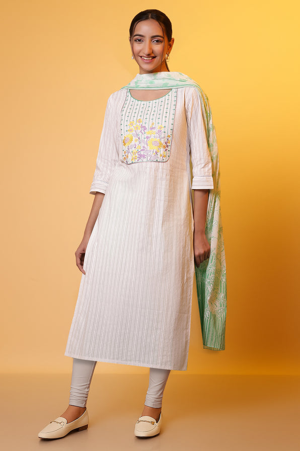 A fresh take on casual elegance! This white floral embroidered kurta set for women combines comfort and style effortlessly. The straight kurta features delicate floral embroidery on the yoke, paired with a lightweight dupatta showcasing subtle floral prints. The churidar bottoms add a classic touch to the ensemble, making it perfect for casual outings or relaxed gatherings. Crafted from breathable cotton, this set ensures all-day comfort while exuding understated charm.
