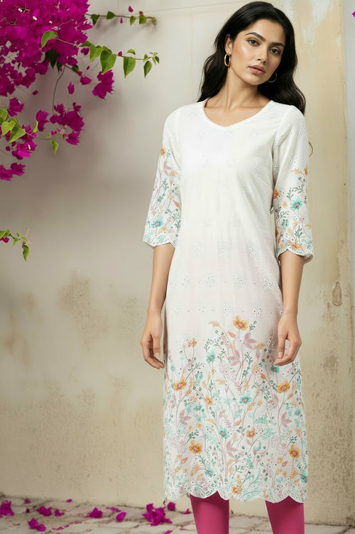 A white rayon kurta, adorned with intricate white schiffli embroidery throughout, exudes timeless elegance. Its sleek straight silhouette features a flattering sweetheart neckline accentuated by contrast blue piping along the neckline and sleeves. The delicate blue floral placement print on kurta hem and sleeves lend a charming and sophisticated look to this captivating ensemble.