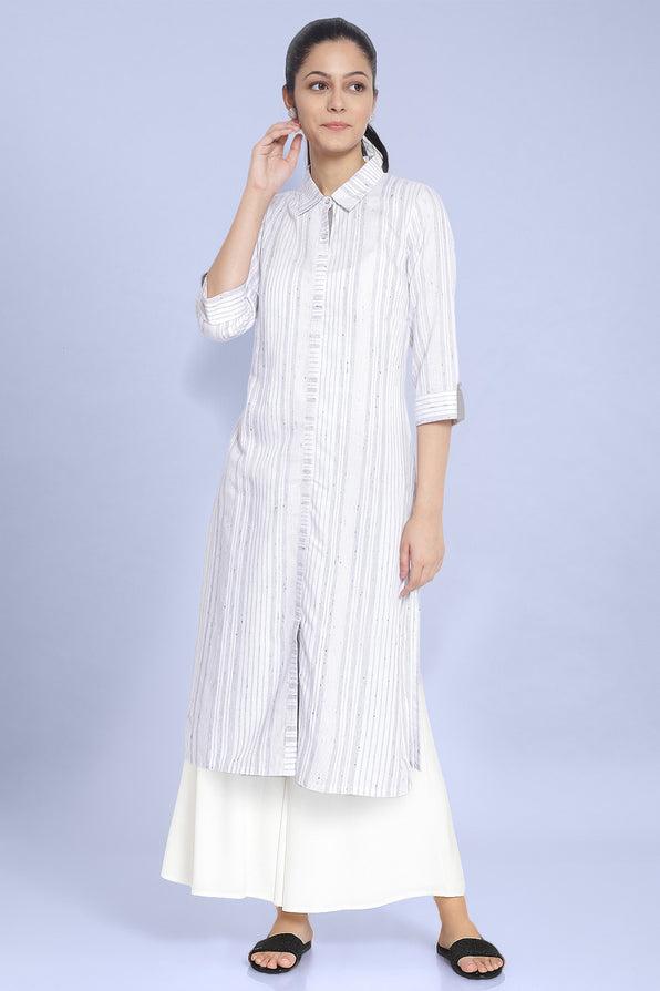Make a minimalist statement with this white straight kurta and palazzo set, crafted from a breathable cotton flax blend. The clean white base is enhanced with subtle geometric prints, giving it a modern yet understated appeal. The straight-cut kurta offers effortless movement, while the airy palazzo pants bring relaxed sophistication to your look. Ideal for summer festivities and casual outings alike, this kurta set for women is as comfortable as it is stylish. The cotton flax fabric provides a crisp structure, keeping your ensemble fresh and polished throughout the day. Perfect for pairing with delicate or bold accessories depending on the occasion, this versatile set works beautifully from brunch gatherings to evening catch-ups.