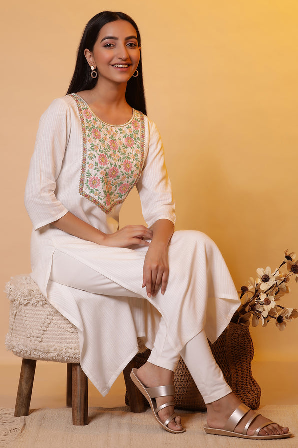 Enjoy the desi vibes in this floral embroidered straight kurta. The beautiful intricate embroidery on yoke and the texture fabric together looks very premium.