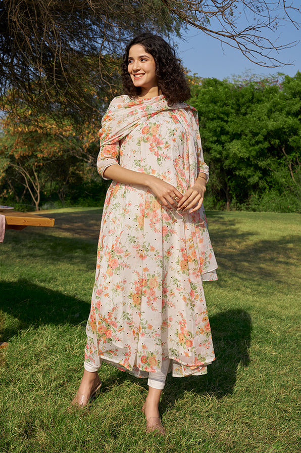 Elevate your ethnic wardrobe with this stunning Aurelia fusion set. Crafted from 100% polyester, this special occasion ensemble features a white anarkali, leggings, and dupatta. The woven construction and round neckline add a touch of elegance, while the three-quarter sleeves offer comfort and style. The flared silhouette of the anarkali creates a graceful flow, perfect for festive gatherings. The digital print adds a modern twist to this traditional outfit. Hand-wash recommended to maintain its pristine condition. This versatile set combines the best of ethnic and contemporary fashion, making it a must-have for women who appreciate fusion wear. Pair it with stylish sandals to complete the look, exuding effortless elegance. Versatile and timeless, this outfit is perfect for making a statement at any occasion, day or night.