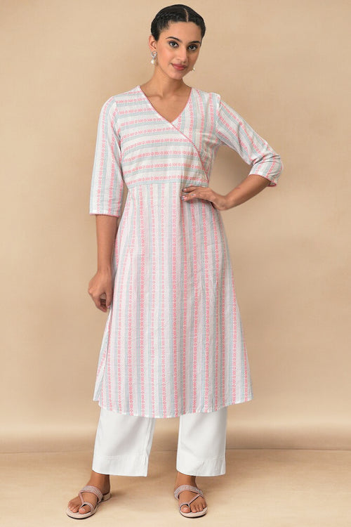 Crafted in pure cotton, this white A-line kurta and palazzo set is the epitome of effortless grace. The A-line cut offers fluid movement, while the all-white design makes it a canvas for accessories. Perfect for summer outings or simple cultural occasions.