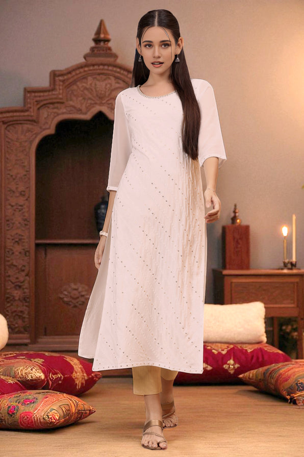 This festive kurta, crafted from Rayon fabric, features intricate Schiffli embroidery in a rich pristine white tone. The design combines elegance and comfort, making it perfect for celebrations and special occasions. Lightweight and breathable, it offers a luxurious feel while enhancing your festive style with timeless charm.