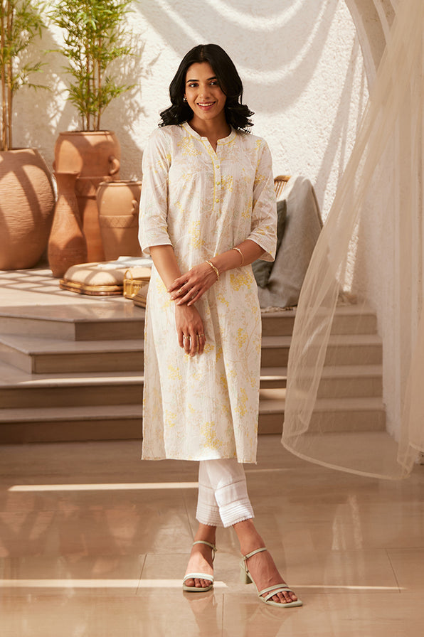 This breezy printed seer sucker kurta is a perfect pick for this season, featuring mandarin collar with contrast piping detail along with minimal buttons to enhance the look.