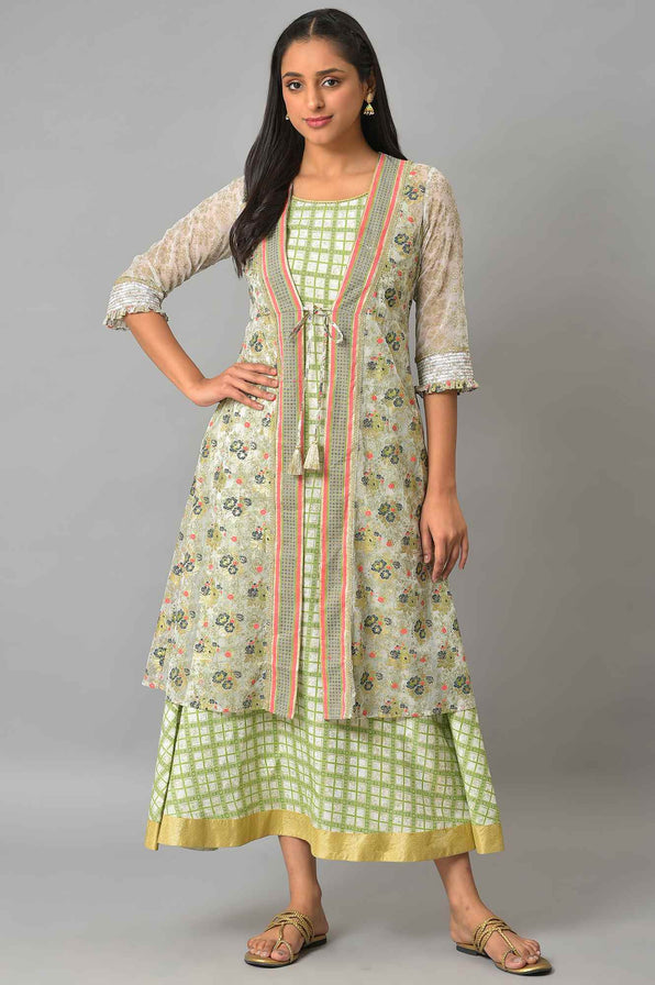 Look Like A Diva With This Gorgeous Dress With Gillet Set. Featuring Stripe And Floral Prints Together In The Perfect Tone Of Green. This Style Looks Very Stunning When Worn And Can Be Styled At Any Evening Soiree.