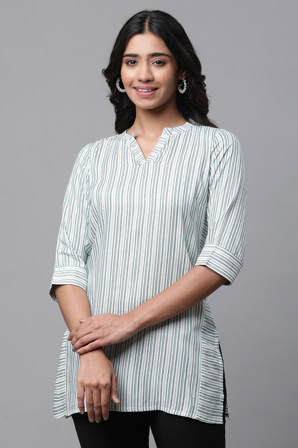 Ethnic kurti add polish and relevance to this design. Keep your look casual and chic with this white short kurti featuring crisp blue vertical stripes. A flattering V-neck brings balance to the shoulders while elongating the neckline. Crafted from soft rayon, it provides breezy comfort and a fluid fall through busy days. The short length makes styling effortless—pair with slim trousers, palazzos, or denim for a modern fusion spin. Subtle striping creates a clean, elongating effect that reads smart at work and relaxed off-duty. Minimal finishing and neat stitching keep the look polished without fuss. This kurti for women delivers everyday versatility with a fresh, contemporary feel you’ll reach for repeatedly. This elegant piece balances comfort and style for daily wear. A versatile choice that pairs beautifully with your wardrobe. Refined detailing keeps it timeless and easy to style. Elevate everyday dressing with a polished, feminine finish.
