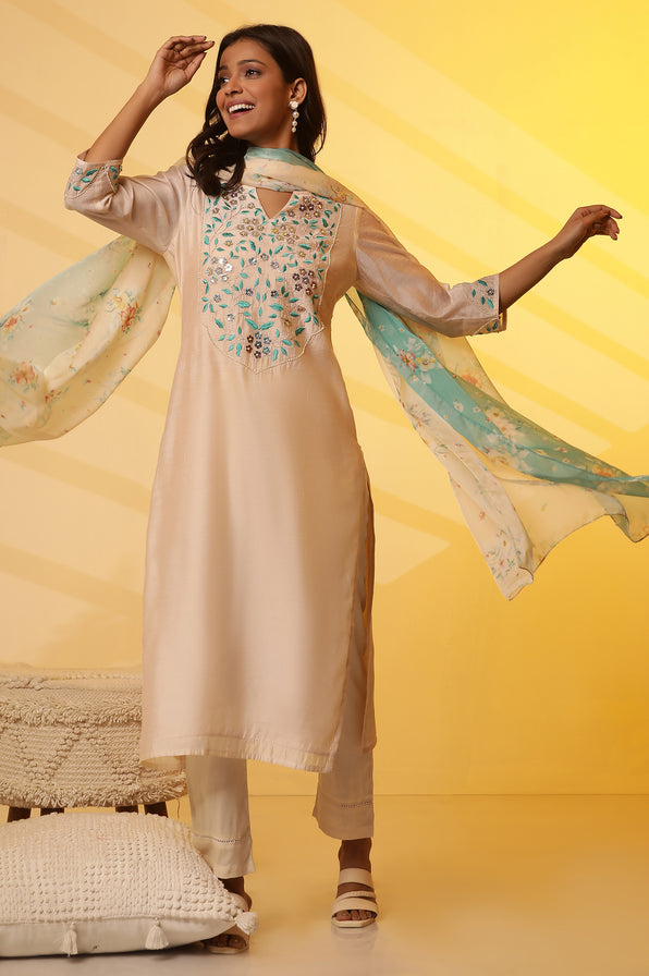 A Straight kurta in exclusively curated texture fabric, adorned with Golden zari embroidery. It is paired with matching bottom and a complimenting jacquard dupatta with beautiful bird motifs.