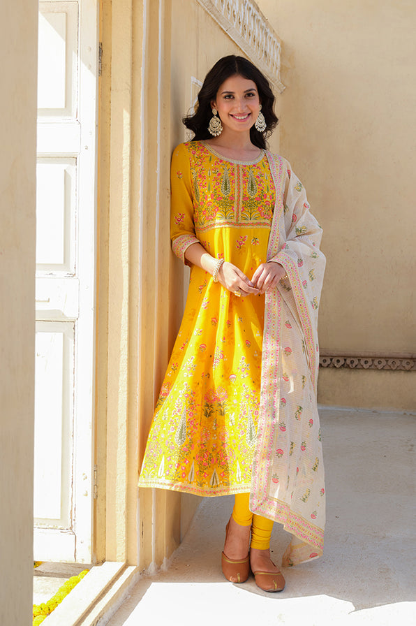 This A-line flared floral printed kurta features delicate lace detailing along the neckline and sleeves, adding an elegant touch to its design. Paired with a printed drape crafted from Kota fabric, it exudes sophistication and style. Completing the ensemble, the jersey leggings offer comfort and versatility, making it perfect for various occasions.