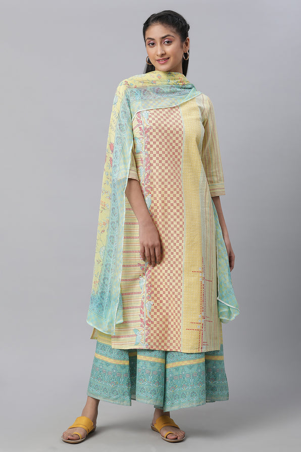 Get the modern ethnic look in this pretty yellow printed straight kurta set. The set has round neck kurta which is paired with printed culottes and chiffon dupatta.